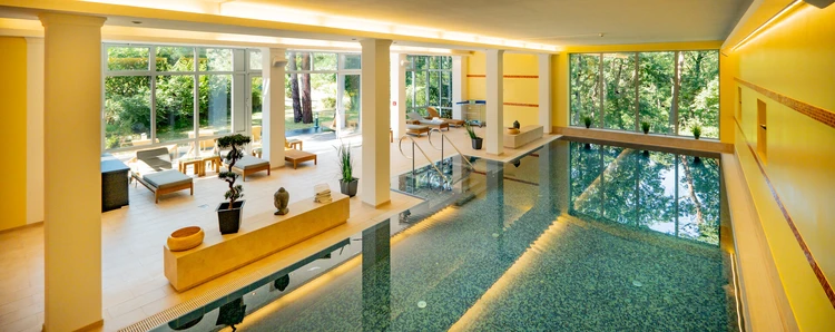 Unsere Klinik vereint Geborgenheit mit großzügigem Ambiente. Helle Zimmer mit Blick in den Wildpark, Aufenthaltsräume, Fitnessstudio, und ein moderner Sauna-Bereich mit Pool bieten Raum für Rückzug, Austausch, Bewegung und Entspannung.
